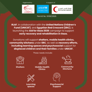 On 8 January 2026, RLAF began the new year with a renewed commitment to sustainable recovery for communities devastated by the crisis in Gaza. In partnership with the United Nations Children’s Fund (UNICEF) and the Egyptian Red Crescent (ERC), the Aid for Gaza 2026 campaign focuses on restoring essential services and rebuilding critical infrastructure for the most vulnerable.