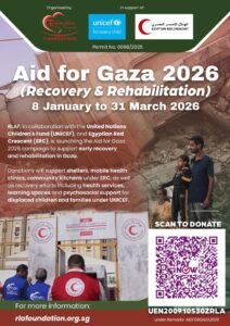 The ceasefire implemented in late 2025 has created a crucial window for action, an opportunity for the Singapore community to step forward and do more. Building on the overwhelming generosity shown in previous Gaza fundraising efforts, RLAF’s Aid for Gaza 2026 campaign is strategically focused on three urgent priorities: